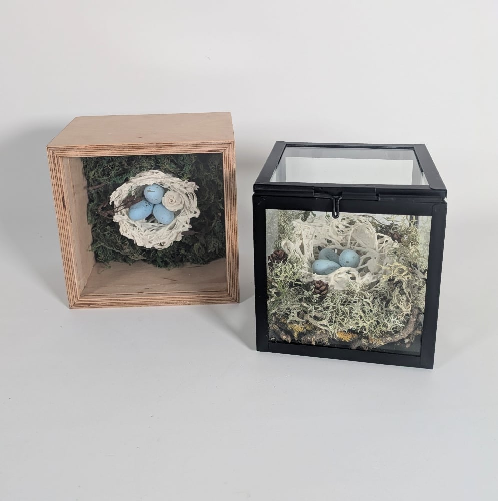 Nest (in wooden collection box). 13.5cm high x 14cm wide x 9cm deep approx.
