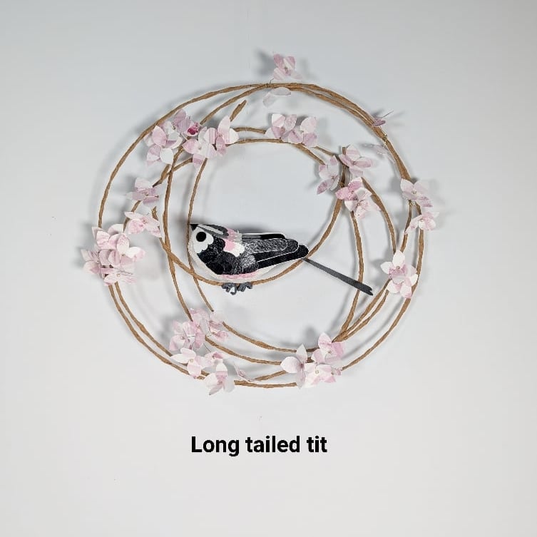 Long Tailed Tit Floral Wreath (wall based or suspended) 27cm high x 27cm wide x 5cm deep approx