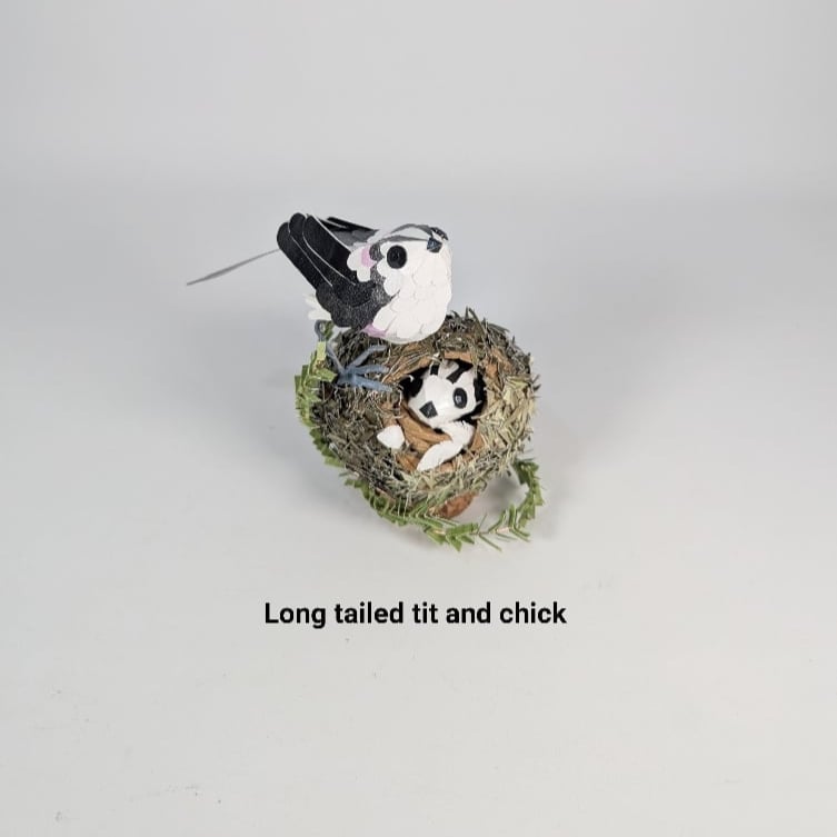 Long Tailed Tit with chick (freestanding). 17cm high x 16cm wide x 11cm deep approx.