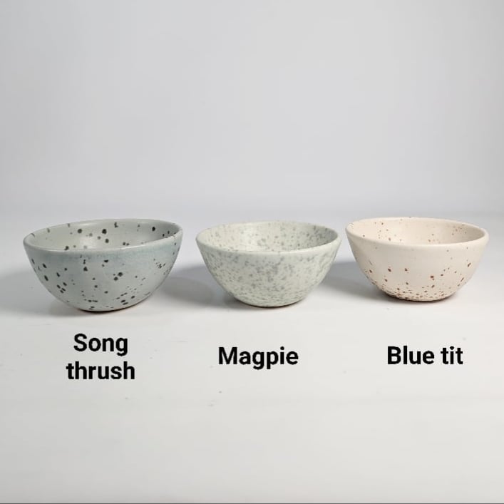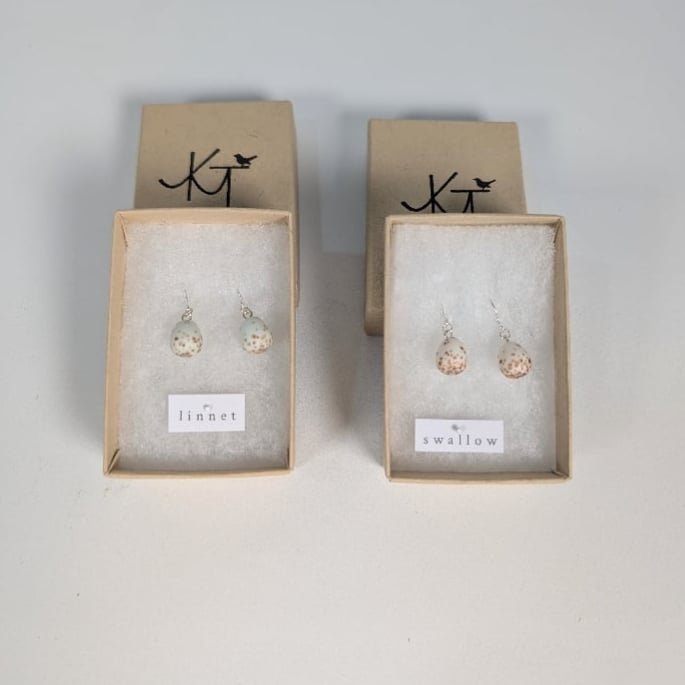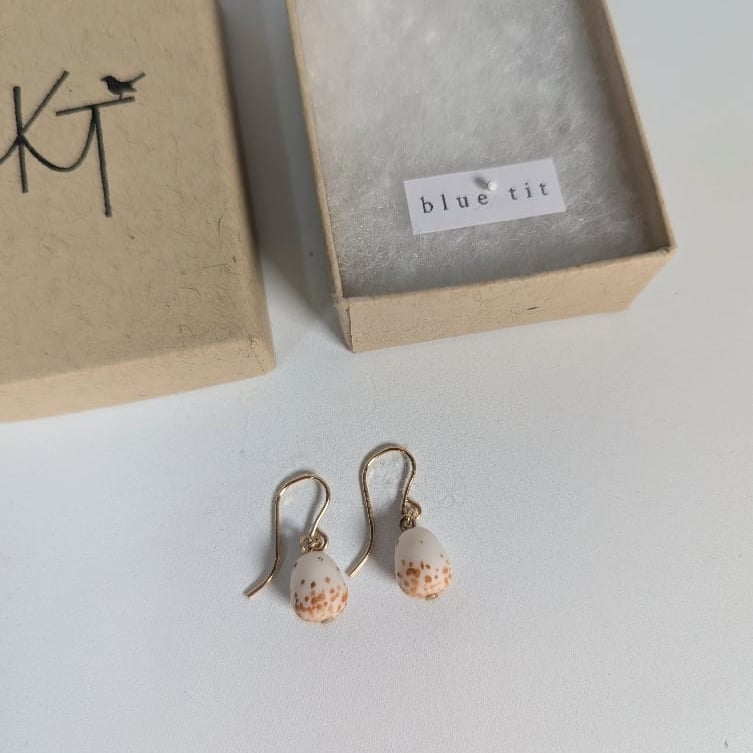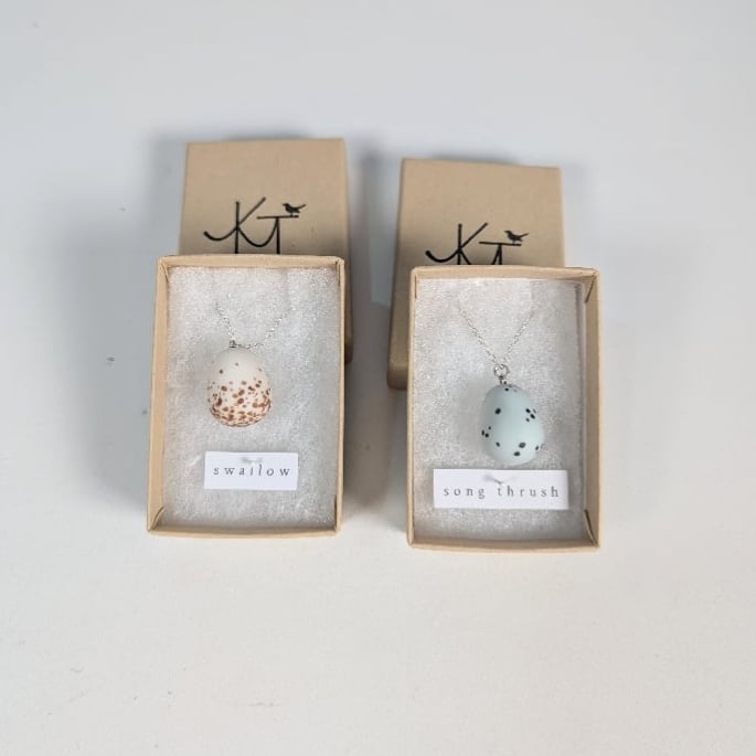 Ceramics inspired by the eggshells of British birds created by Katie Timson, from Stoneware, Porcelain, Sterling Silver jewellery findings and 14ct Gold Filler