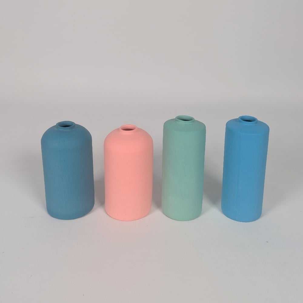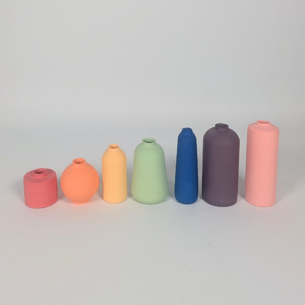 Rainbow vessels by Natalie Bell created from slip cast Porcelain.
